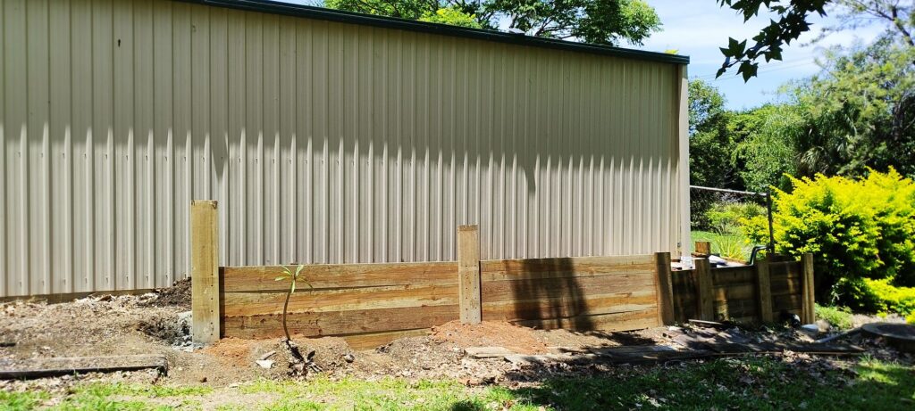 As you can see above the existing bit of wall is not square, it was just too difficult to remove the old steel fence which was holding up the old timbers and so I just built around it. The new section I am doing now that will join to it will be square to the shed and I don’t think it will look out of place once it’s done.