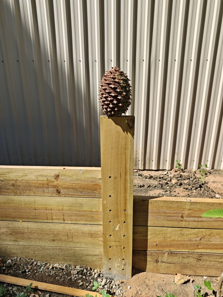 For weeks the Corellas and Cockatoo’s have been making a hell of racket in its canopy. They have very strong beaks and claws and they can easily rip open one of these massive pinecones, you really have to see it to believe it. You just don’t want to be anywhere near it when gravity kicks in or you will be pan breed. By the way the post it is sitting on is 200mm wide, that’s 8″ in the old money!