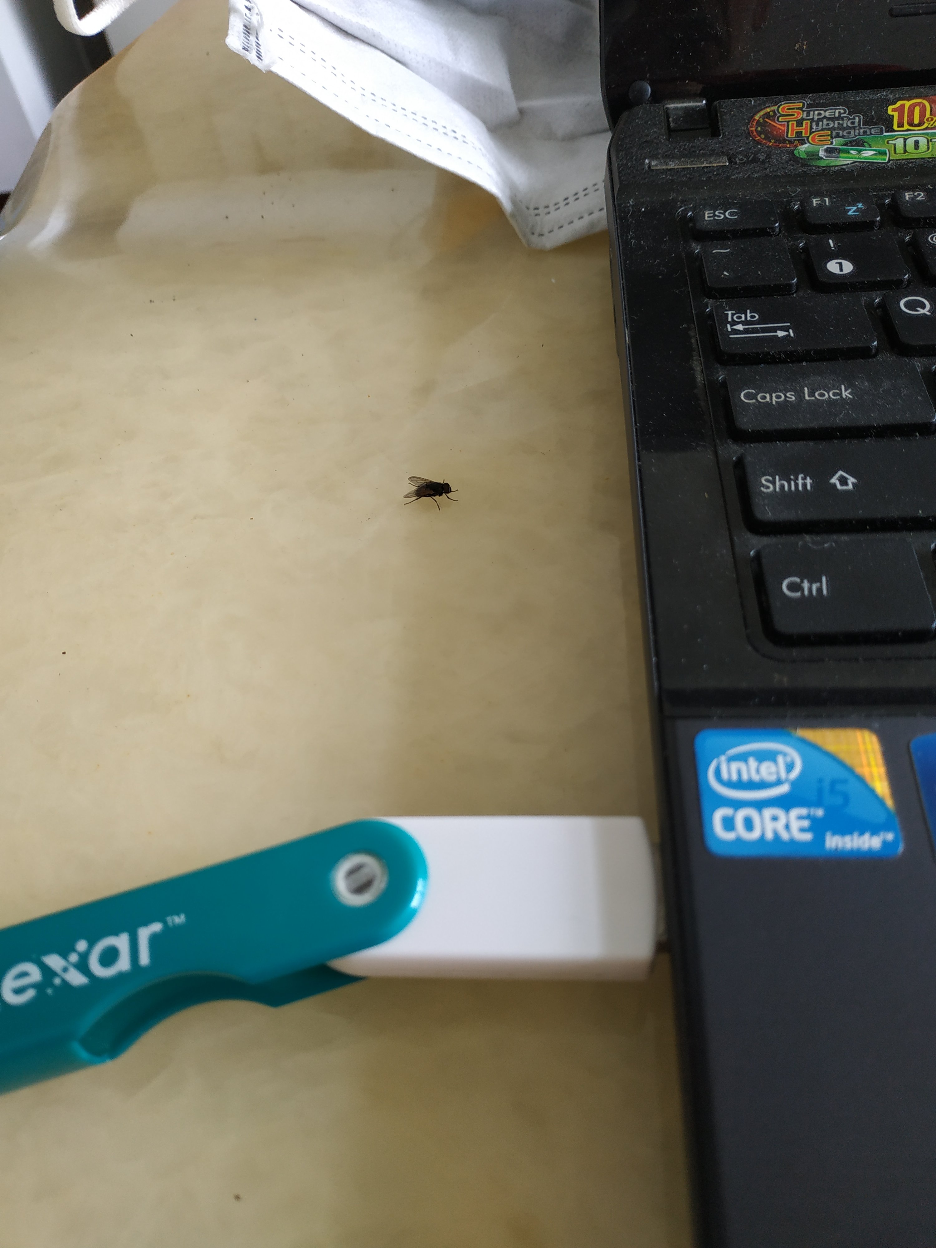The other day it was a wee bit fresh and I was working on my computer and all of a sudden this wee fly came by and flew around my head and then he sat down beside the computer on the table.