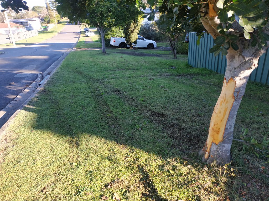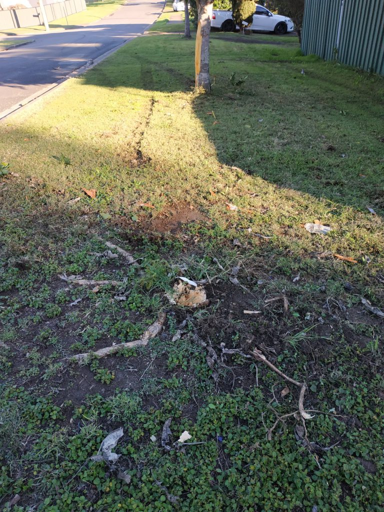 About 5 minutes later there is an all mighty bang and the bedroom is illuminated as the sensor lights switch on. Outside there is a car half way up on the grass strip outside the gate. My Mum’s Frangipani tree is lying on the driveway.