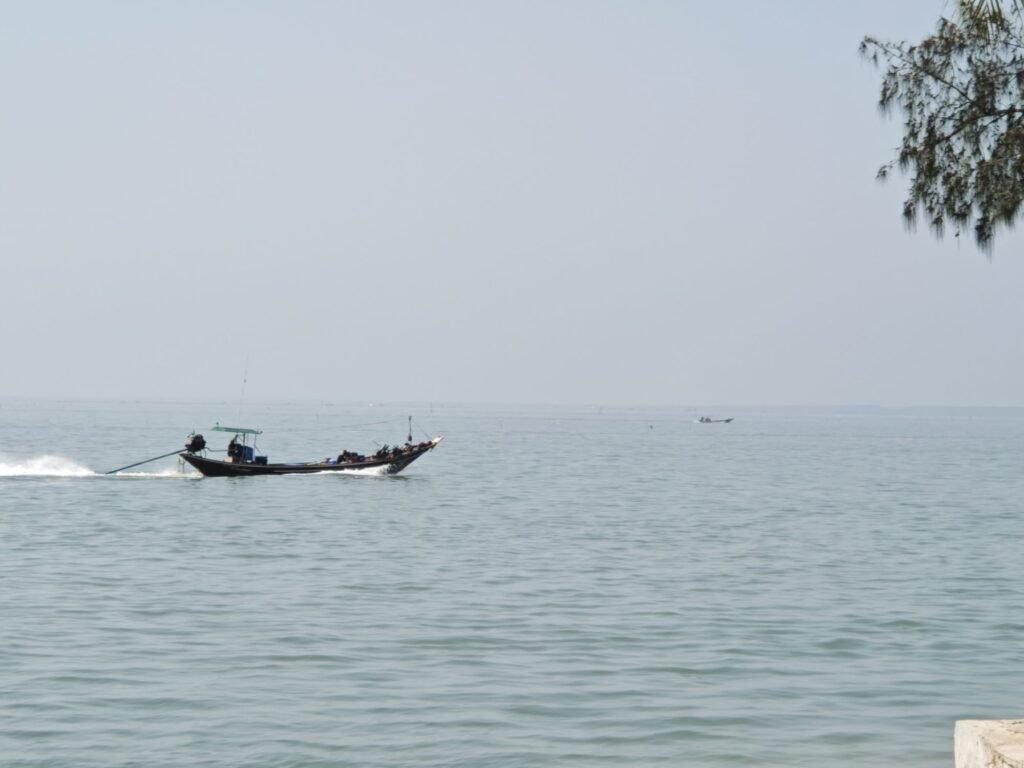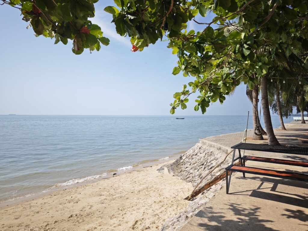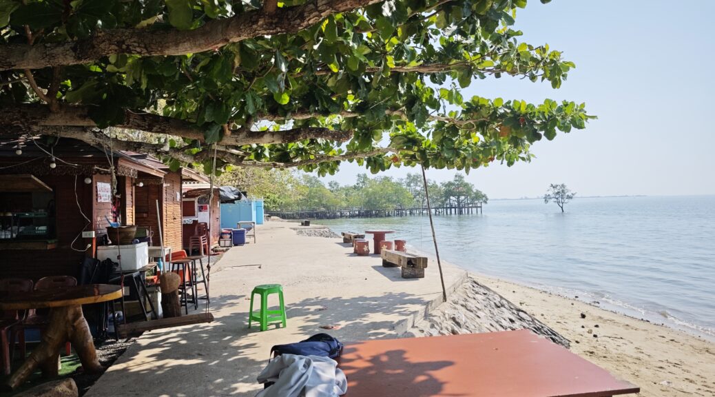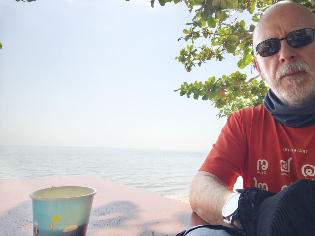 At the back of eight this morning I headed north, found the quietest path to the beach. Only problem doing this was that the village roads were as rough as a badgers arse. It’s not only the UK that has big holes to traverse. I was doing a steady 30 kph and every man and their dogs were passing me and so it took a wee while to reach my beach destination for coffee. Leam Pho beach is small but pretty and before I came here I looked at Google Maps and thought that it would be a lot bigger. However after I left this beautiful oasis there was not much left to see apart from farm land and coconut palm groves.