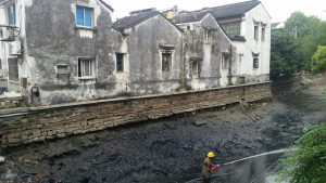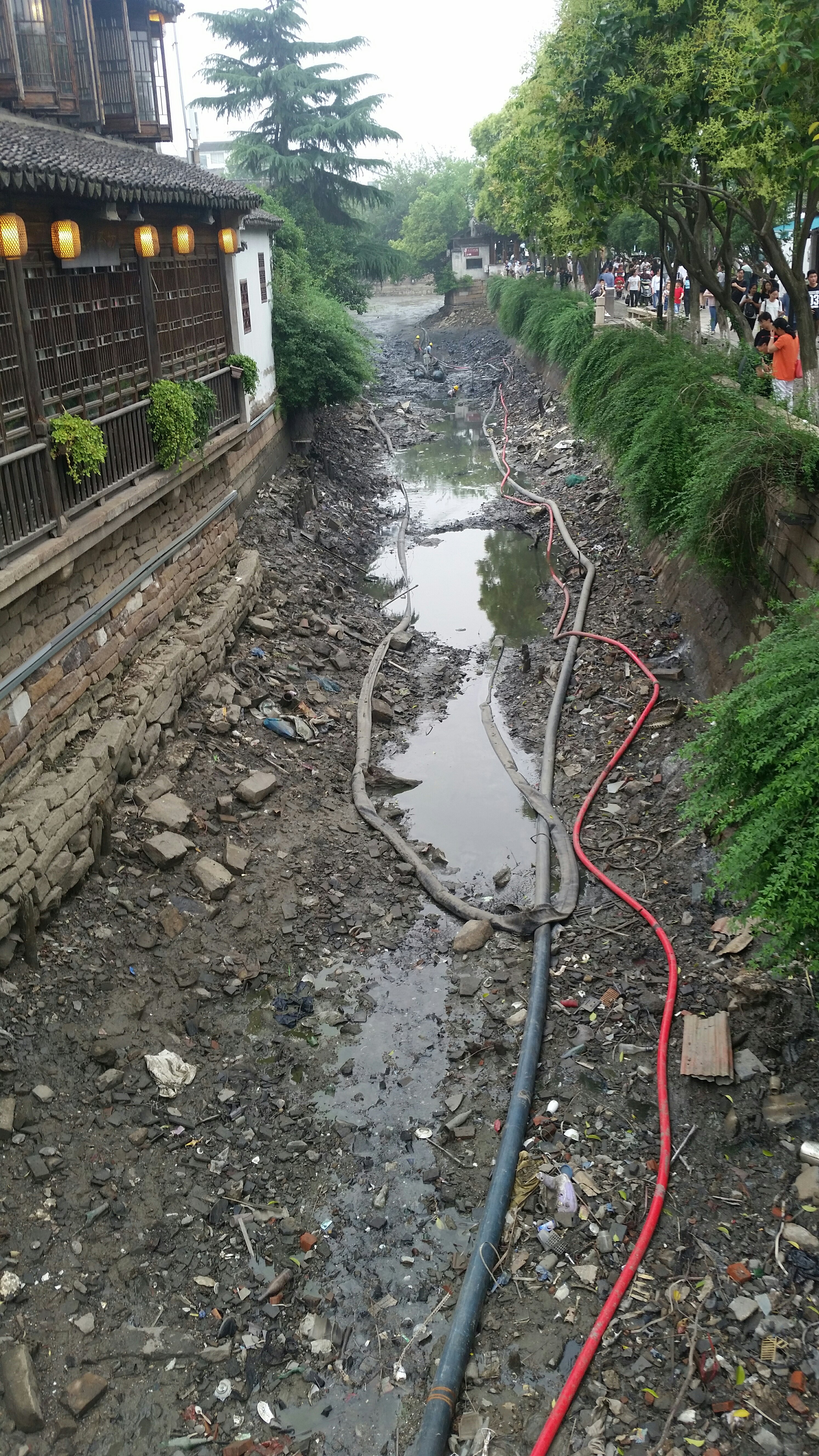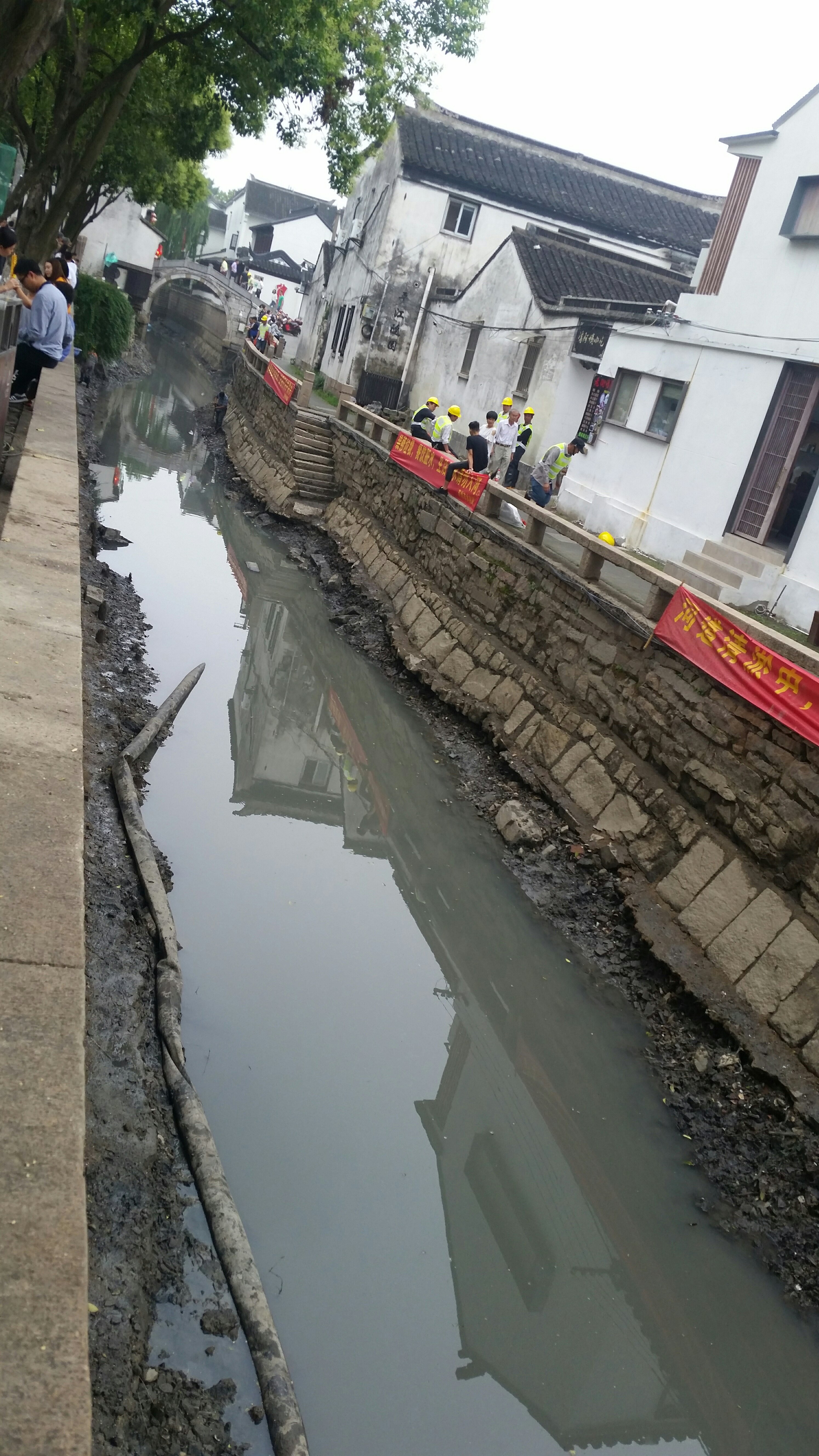 We had lunch in Pingjiang Lu, which is the main tourist street in the old city which lets us see an example of how the old Suzhou really looked. I’ve walked up here many times and have seen them pick the rubbish out from the water using nets. They use small boats with electric engines so that they can go about their business quietly. It’s a very pretty street and a main attraction. Today however I was surprised to see that for almost the complete length of the business area, the water has been drained. It looks like they are shoring up the banks and the building running alongside the river, maybe even under pinning the buildings. You can see many of the old timbers sticking up but they are not attached to anything anymore. In places acro props are seen holding up the foundations of buildings that have been undermined by the river.