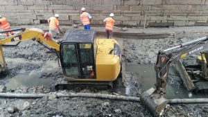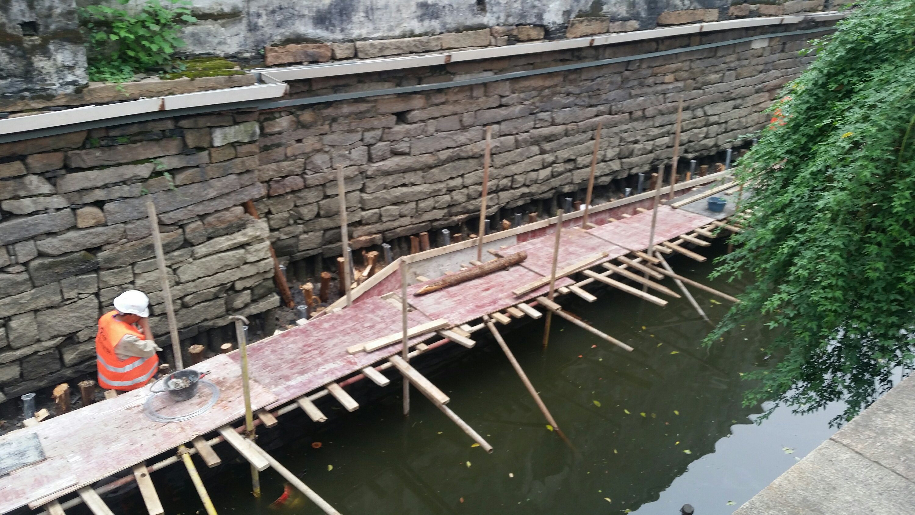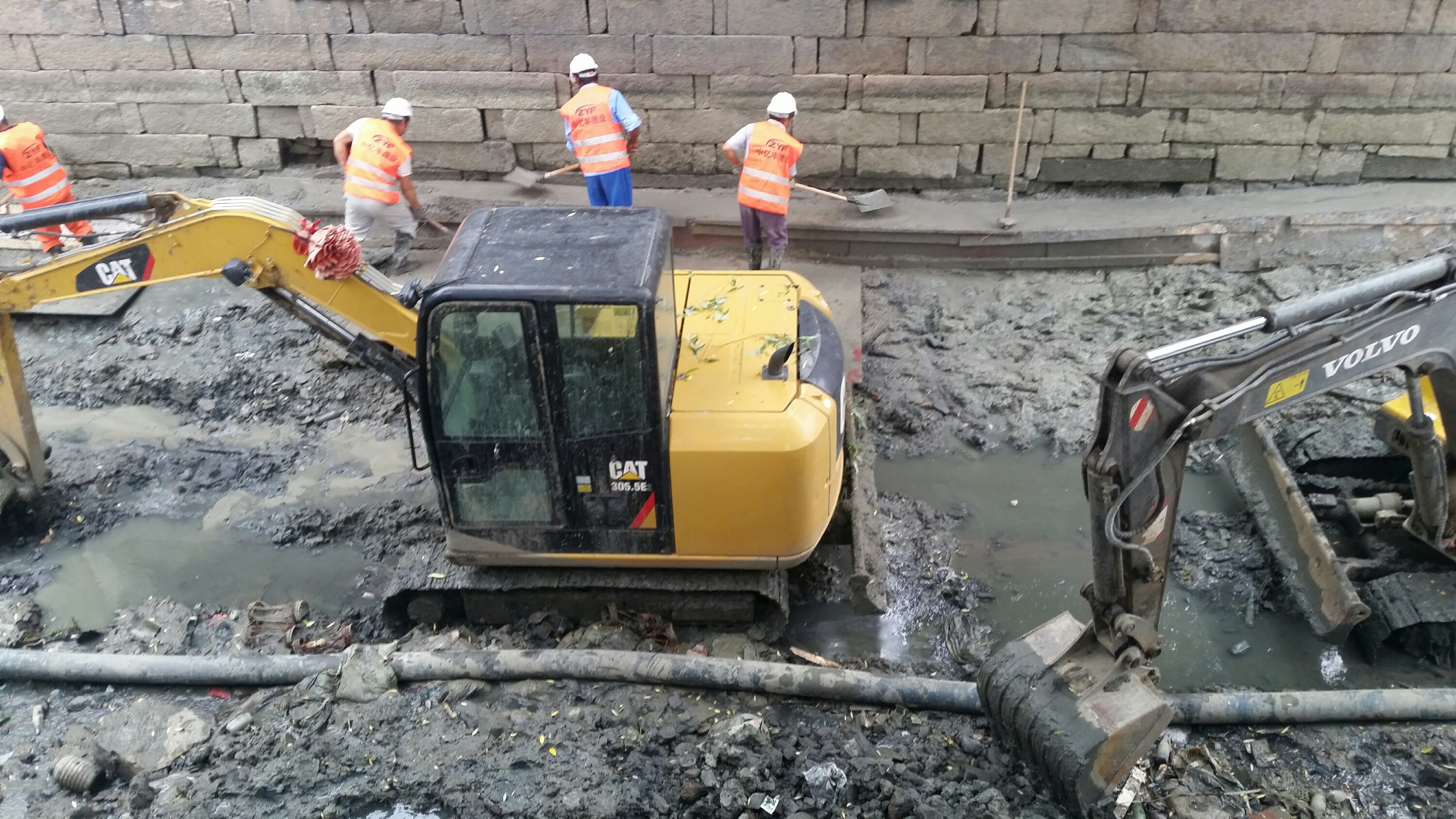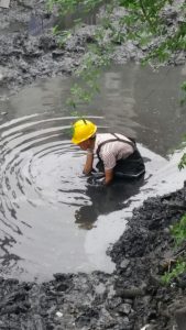There using a high pressure hose to “clean” the sludge and filth away from the sides of the walls. One guy has both arms in the water and sifting the river bed looking for god knows what, bare handed and black up to the elbows. I was pleased to see however that he had his safety helmet on.