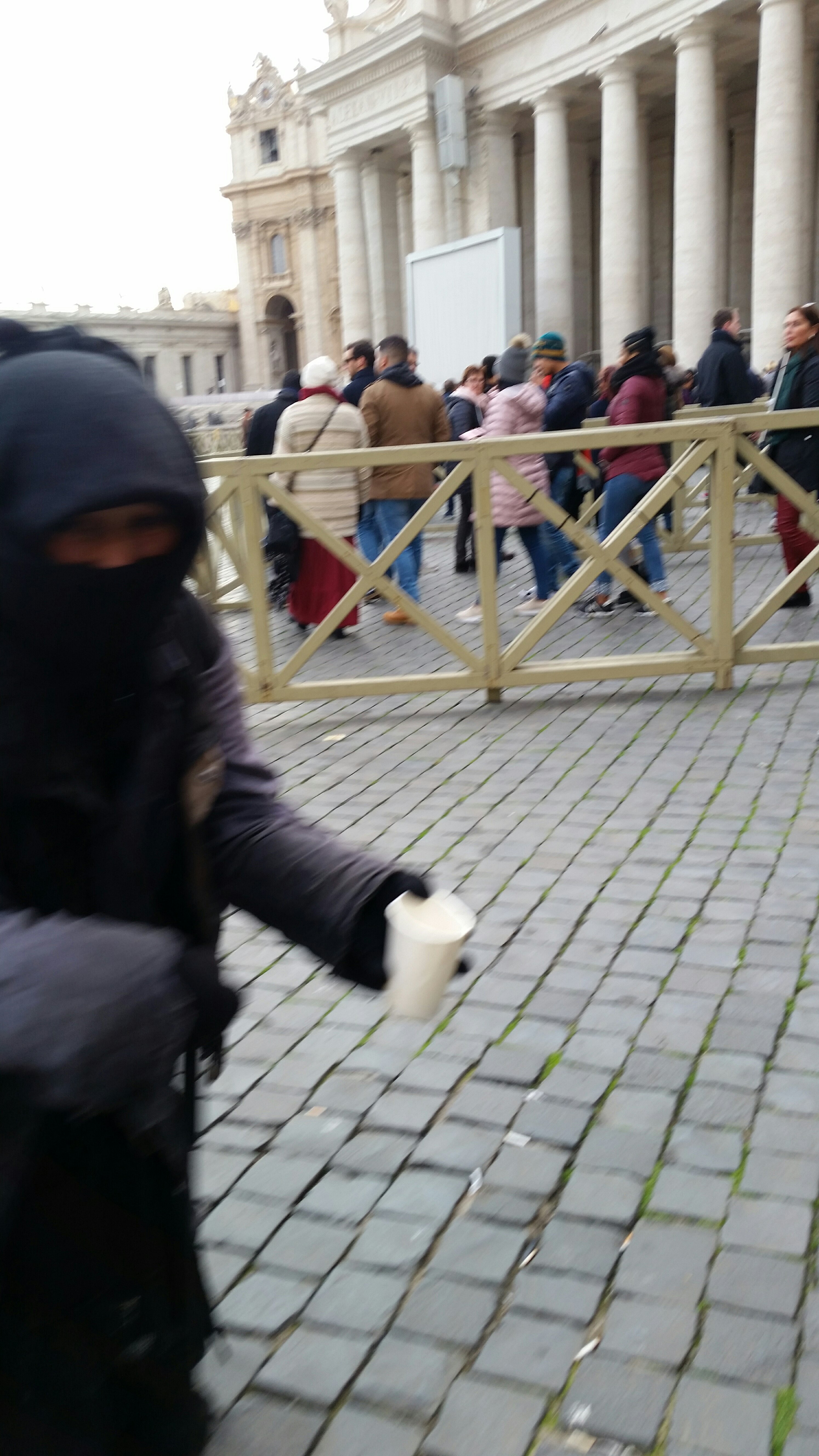 But then you get the other ones, the chancers and they are no more a beggar than I am. This old dear pictured below was a prime example. Her clothes were very clean but made to look old. She moved with such perfect grace in are shaking of the walking stick and crying “Grazie Grazie” and other things that I don’t understand. She knew how to work a crowd, but I noticed that she kept her face well covered, but her scarf slipped a little and you could see that the eyes behind this wee woman were very shiny and there was no sign of despair or sadness. The rhythm of her voice matched the rocking and shaking of her frail body, in my opinion she was full of shit and this was her day job and no doubt makes quite a bit of money by doing so. I should have got her on video to let you see this Oscar winning performance. And you know when they say” Grazie” their voices just break enough to make you think they are going to greet. There were about 3 old women working at St Peter’s but this one was the most active, the others were either sitting or begging beside a pillar. This guy above, well I don’t what he was on.
