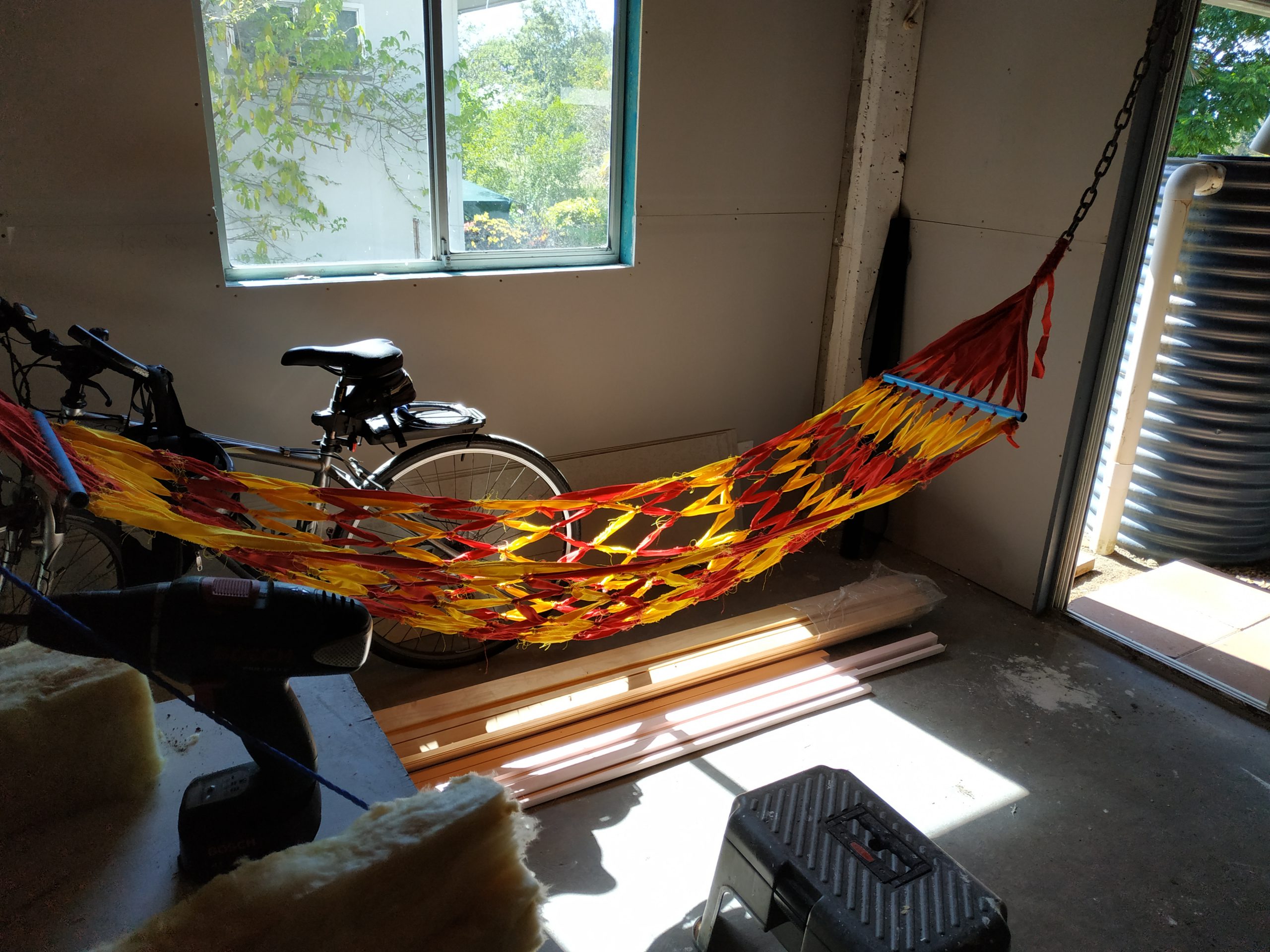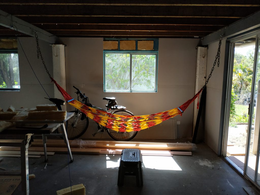 Today was the day for the hammock. It was given to me by my good friend Anne from Thailand many years ago. I use to have it outside under the deck but I decided that I would put it inside in the new room under the house, mind you I have two hammocks so I might still put one outside.