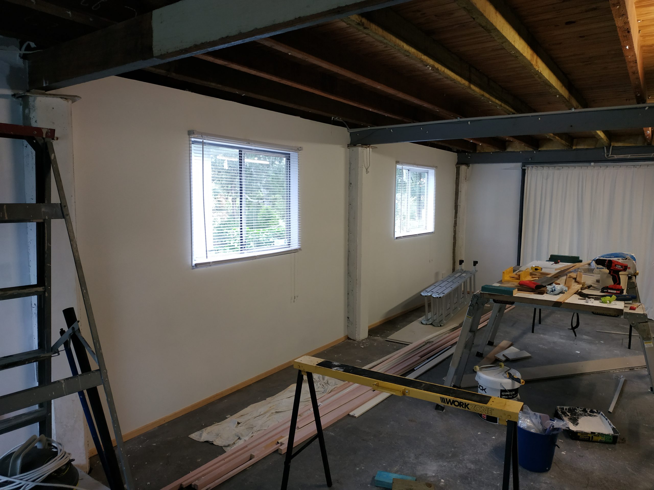 The drips are few and far between and I soon nod off. In the morning I’m glad to see that, well there was nothing to see really. The bucket was only slightly wet, the towel was dry and there was no visible signs of water damage. The rain is still coming down. The forecast is for sun in two days’ time and because there is only a little bit of water coming in I’m not prepared to go up on a wet corro roof and so I started on the architraves and skirting boards which was way safer and more enjoyable than clambering around on a wet tin roof.