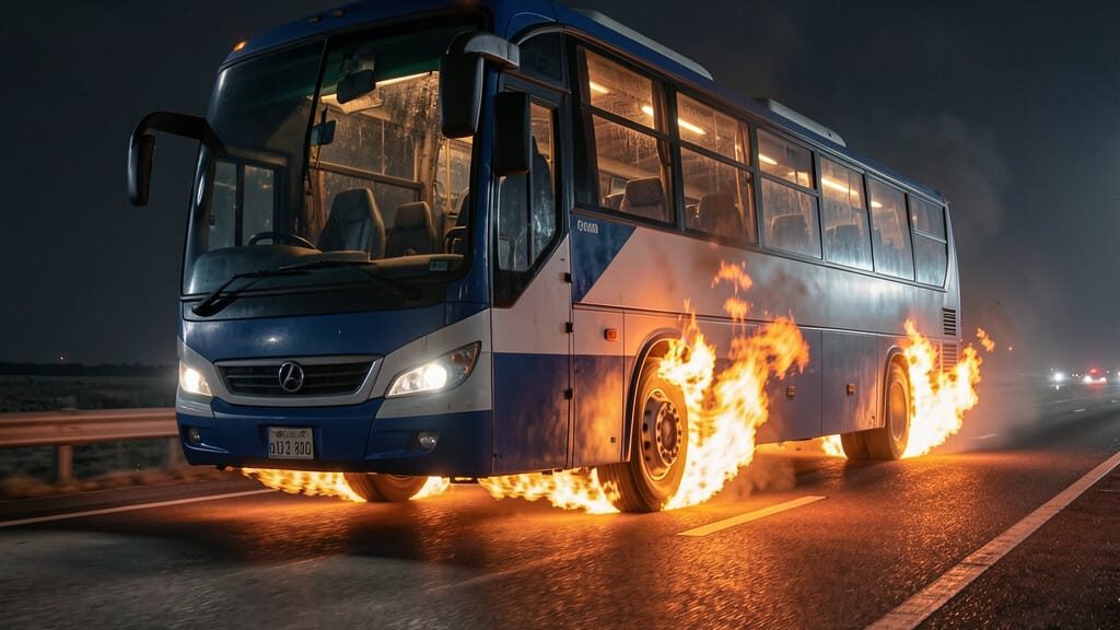 I pulled over as soon as I could. Stopped and got out to check and the blue smoke was billowing out, although no flames. One of the other bus drivers pulled up behind me and grabbed his fire extinguisher and blasted the rear wheels and I went and got some water.